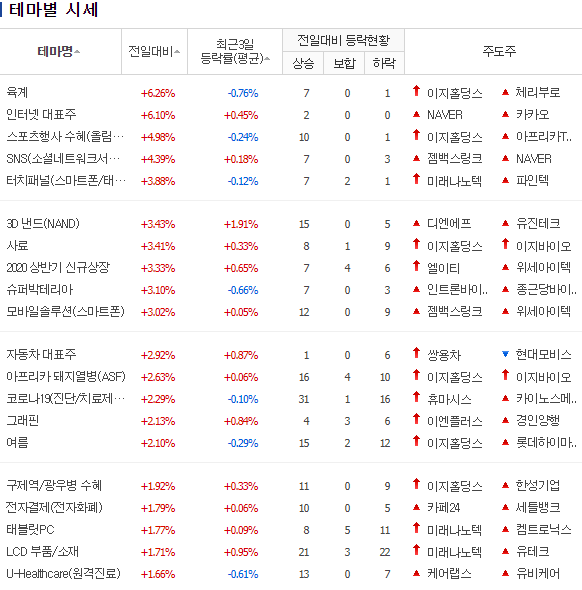 6월 22일의 테마주에서 육계, 인터넷 대표주, 스포츠행사 수혜주 등이 시장을 끌고 갔다. 여기서 오늘 NAVER가 8%이상 오른게 큰 포인트이다.