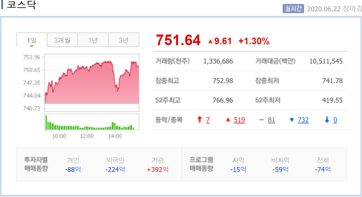 4월에 코스피는 1400대, 코스닥은 400대로 52주 최저치를 기록했다가 반등하며, 6월 22일 현재 코스피는 2100대, 코스닥은 700대로 올라왔다.