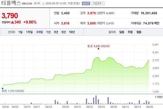 티플랙스는 쎄노텍과 함께 급등하고 있는 종목 중 하나로 올해 최근 들어 주가가 급등하며 오르고 있다. 조정이 오면 매입했다가 가격이 오르면 매도를 해서 수익을 내면 좋을 것 같다.