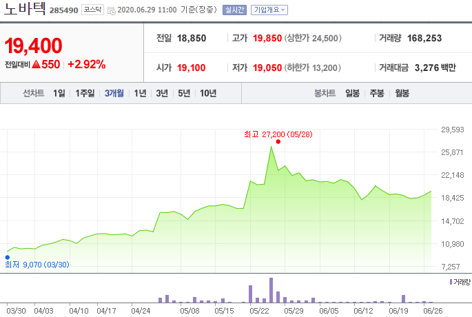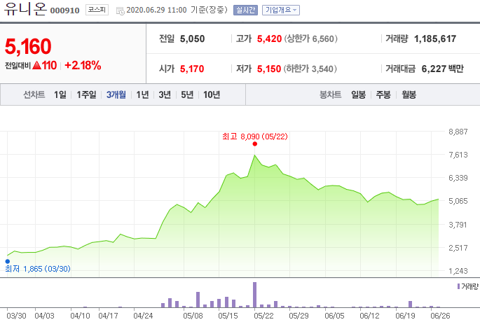 3월 30일만 해도 9천원이었던 주가가 2개월 만에 3배가 올라버렸다. 현재 수익이 별로 안 좋아 주가가 내려갔지만 경기가 좋아진다면 다시 충분히 오를 수 있는 매력적인 종목이라고 생각한다.