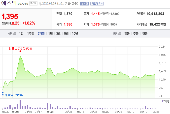 3월 30일에 가격이 가장 낮았는데, 1주일 사이에 가격이 급등하며 2.5배나 올랐다. 현재 1,400원 정도의 평균가를 유지 중이며 매입하는 것을 추천하지 않는다.