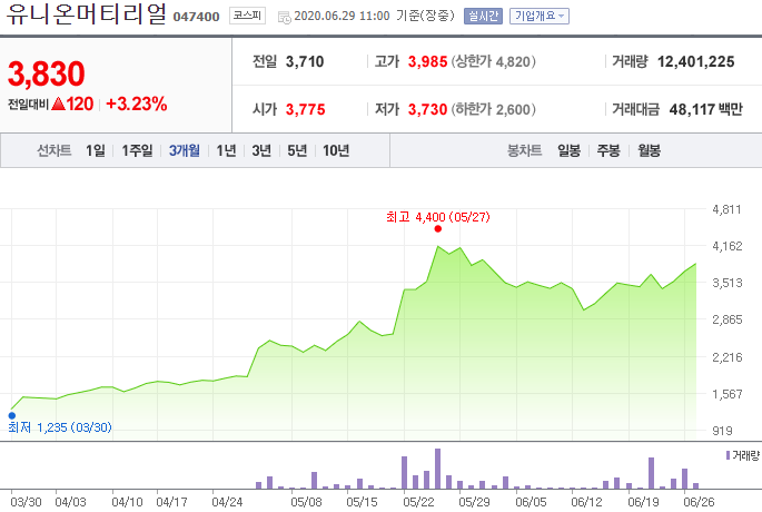 희토류의 대장주로 유니온과 유니온머티리얼이 있는데, 항상 같이 올라가는 종목 중 하나로 거래량은 유니온머티리얼이 훨씬 높다. 희토류 테마가 주목받으면 항상 올라가는 종목이기에 현재 가격에서 매입해보는 것도 나쁘지 않다고 생각한다.