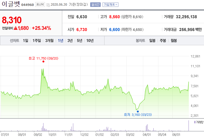 이글벳은 아프리카 돼지열병 당시 연속으로 상한가를 치며 큰 관심을 받아왔다. 나 역시도 이글벳이 대장주라고 생각하고 코로나로 주가가 급락하면서 5천원대에 매입해서 6천원에 매도한 적이 있다. 현재 중국에서 신종 돼지독감이 발생해서 오늘 주가가 다시 25%나 올랐다.