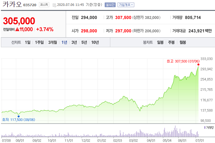 '카카오'의 시가총액은 약 26조 7천억으로 코스피 8위이다. 주가는 매일마다 새로운 기록을 갱신하며 위로 쭉쭉 올라가고 있다. 7월 6일 현재 30만 5천원을 찍으면서 전일보다 11,000원이나 올라버렸다.