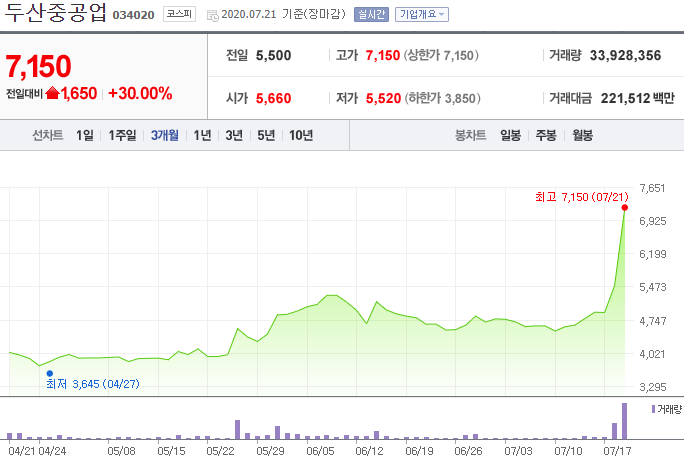 새누리당의 정치와 연관되어있어 현재 미래 통합당의 정권으로 교체되면 두산중공업의 주가는 상승할 것으로 보이지만 더불어민주당이 집권하고 있어 주가는 상승할 일이 없어 보인다. 하지만, 그린 뉴딜 사업으로 두산중공업은 풍력에너지 사업도 하고 있어서 주가가 갑작스러운 오름세를 보여줬다.