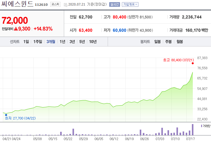 풍력에너지의 모든 것을 담당하고 있으며, 가장 관련이 높은 주식이라고 말할 수 있다. 주가는 8만원대로 비싸지만 4월에 비해 약 300%나 오르며 계속 상승하고 있다. 앞으로 그린 뉴딜정책을 하면서 만약 성공적으로 꾸준히 진행된다면 주가는 계속 오를 것으로 전망된다. 관망하다가 조정이 왔을 때 매입하는 것을 추천한다.