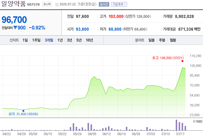 아스트라제네카 관련주가 나오면서 장이 시작하자마자 급등하는 모습을 보여줬다. 기대감으로 1, 2회 성 주가 급등이었으며, 현재 9만 6천 원에 위치하고 있다. 어디서 먼저 백신이 만들어질지 잘 모르겠으나 일양약품을 관망을 하며 떨어질 때 매입하는 것도 괜찮아 보인다.
