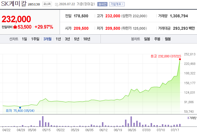 나파모스타트 관련주가 한때 인기였는데, 파스퇴르와 연관되어 있어서 SK케미칼의 주가가 올랐다. 또한, 5월에 비해 현재 현재 300% 이상 주가가 오르며 크게 상승하고 있다.