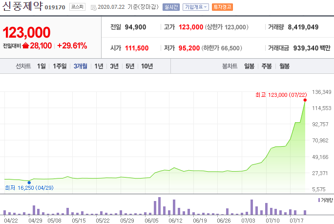 신풍제약은 현재 국산 16호 신약 피라맥스가 코로나 치료제로 주목을 받으며, 7월 2일 약 3만 원이었던 주가는 7월 22일 현재 12만 3천 원이 되었으며, 연속 상한가 행진에 4배 이상 주가가 올랐다. 말라리아 치료제인 피라맥스를 코로나 19 치료제로 개발하고 있기 때문에 주가는 오르고 있으며, 신풍제약의 피라맥스 임상 2상은 오는 12월에 완료되며, 임상 최종 완료일은 내년 2월로 예정되어 있는데, 그때까지 기대감에 의해 계속 오를 수 있다.