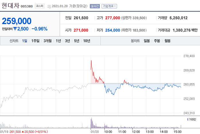 코로나로 인해 현대차의 주가는 65,000원까지 떨어졌다가 꾸준히 우상향을 하며 현재는 259,000까지 올라온 상황이다. 지난 3월 코로나가 시작될때 많이 매수할껄 항상 후회하고 있다. 나는 더떨어질 줄 알고 매수하지 않았던게 한이된다.