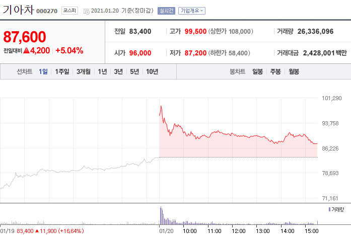 현재 주가가 87,000원대로 애플카와 확실하게 협력을 해서 개발을 진행하게 되는것인지 잘 모르지만 조금 지켜보다가 매수하는 것을 추천한다.