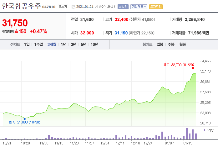 몇일동안 꾸준히 올라가고 있는 종목중에 하나이며, 항상 정체되어 있던 주식으로 많은 투자자들이 멀리했던 주식 중 하나이다. 우주를 좋아하는 사람이라면 몇번 매수했을만한 종목 중 하나인데 딱히 거래량도 많지 않다.