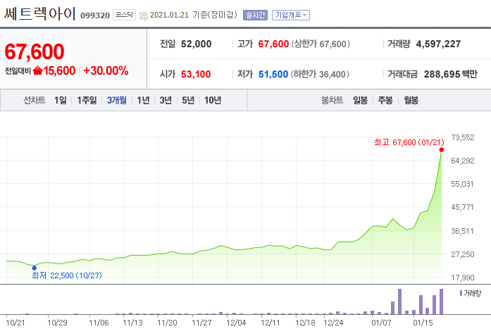 쎄트렉아이는 스마트팩토리와 관련되서 작년 12월부터 지켜봐왔던 종목으로 언젠간 크게 한번 오를것이라고 생각들었지만 이정도로 오를것이라고는 상상도 못했다. 계속 갖고있었더라면 아마... 정말 아쉬움이 크게 남는 종목 중 하나이다.