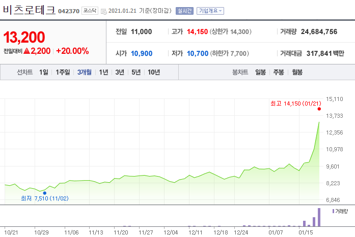 비츠로테크는 처음들어봤는데 항공우주산업이 주목을 받으며 최근들어 갑작스럽게 오르고 있는 종목이다.