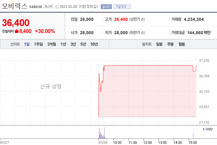 2021년 상반기 신규상장주로는 모비릭스, 선진뷰티사이언스를 꼽을 수 있는데, 둘 다 상장 첫날 상한가를 기록하며 주가가 크게 오르고 있다.