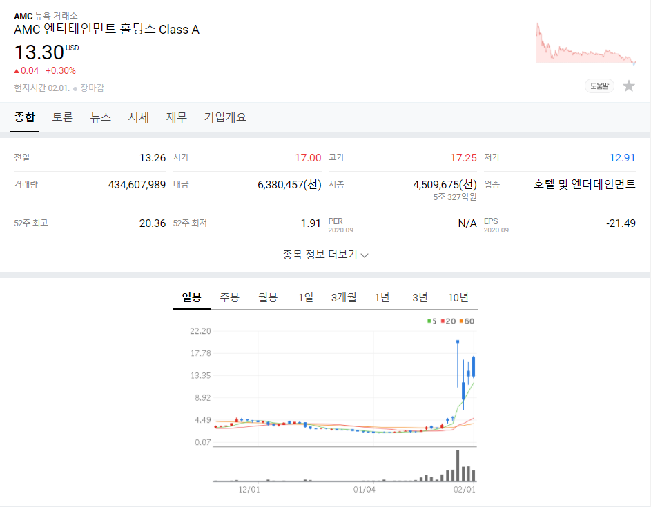 AMC엔터테인먼트는 코로나 사태로 인하여 극장이 대거 문을 닫을 수 밖에 없었고, 부도 위험까지 몰리면서 공매도의 집중적인 공격 대상이었는데 레딧의 월스트리트베츠 커뮤니티에서 GME 다음 종목으로 AMC를 지목하면서 개미들이 이끄는 주가 폭등으로 숏스퀴즈가 일어나게 되었다.