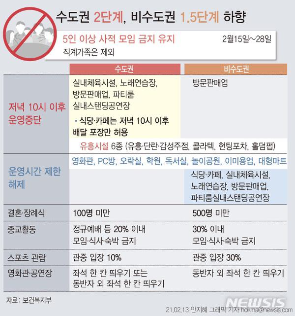 코로나 거리두기가 금일 완화되었으며 수도권은 2단계, 비수도권은 1.5단계로 단계를 조정했습니다. 사회적 거리두기 완화 기간은 2월 15일부터 2월 28일까지로 만약 다시 3차 대유행 조짐이 보이게 되면 기존과 같이 2.5단계로 돌아갈 수 있습니다.