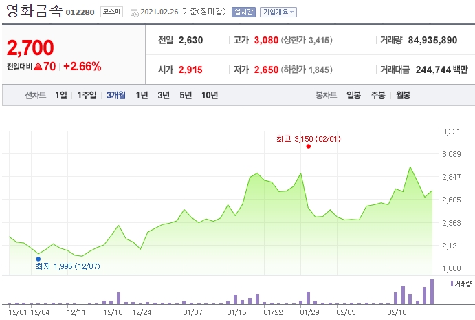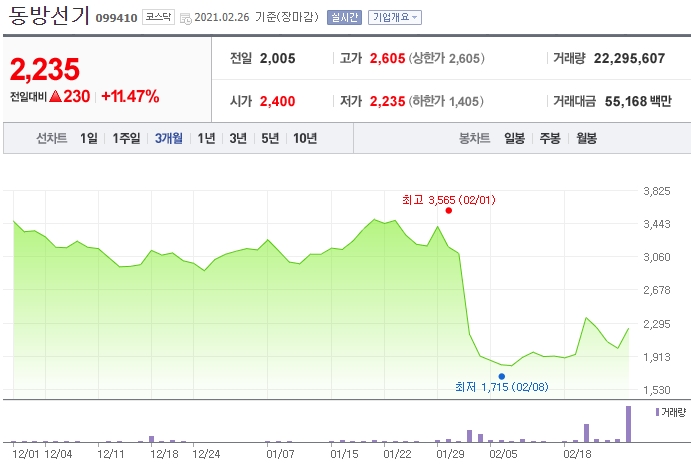 동방선기도 가덕도 신공항 관련주로 테마가 편성되어 있으며 고점에 물려있더라도 손절하지 않고 약 2,700원~3,000원까지 돌아올 가능성이 있습니다.