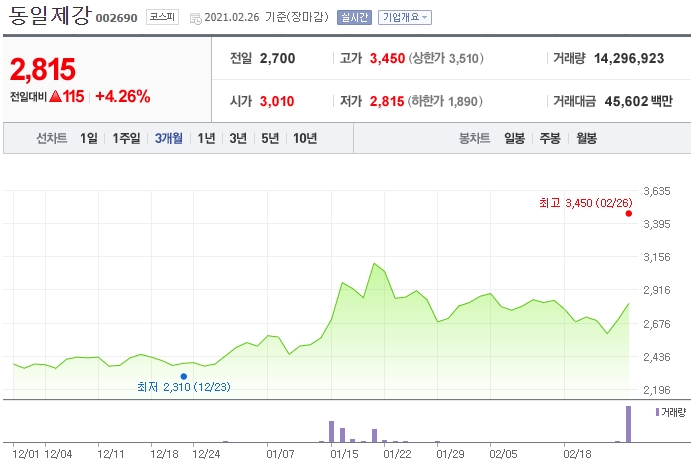 가덕도 신공항 관련주로 동일제강이 떠올랐지만 크게 오르는 모습은 보이지 않고 있습니다. 한 번씩 3,500원 정도의 주가도 오기 때문에 만약 현재 고점에 물렸더라도 손절할 필요가 없다고 생각이 듭니다.