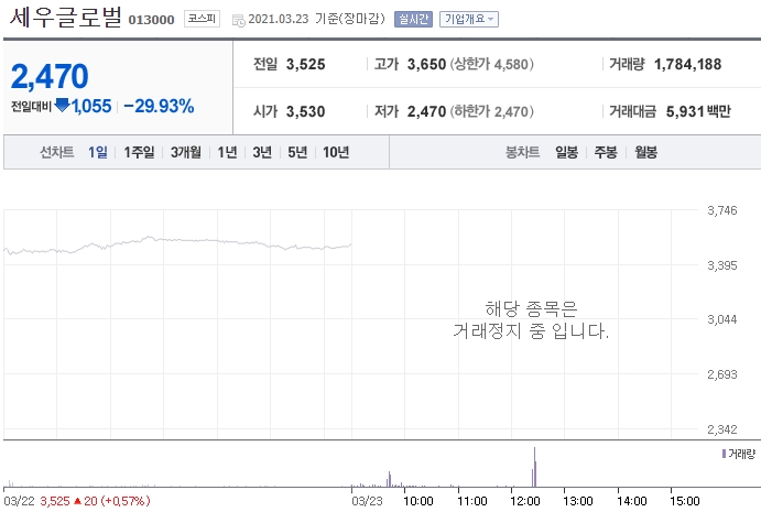 세우글로벌은 회계감사인의 감사의견 비적정설에 거래정지되었습니다. 금일 -29% 하한가를 기록했으며, 상장폐지 절차에 들어갔습니다.