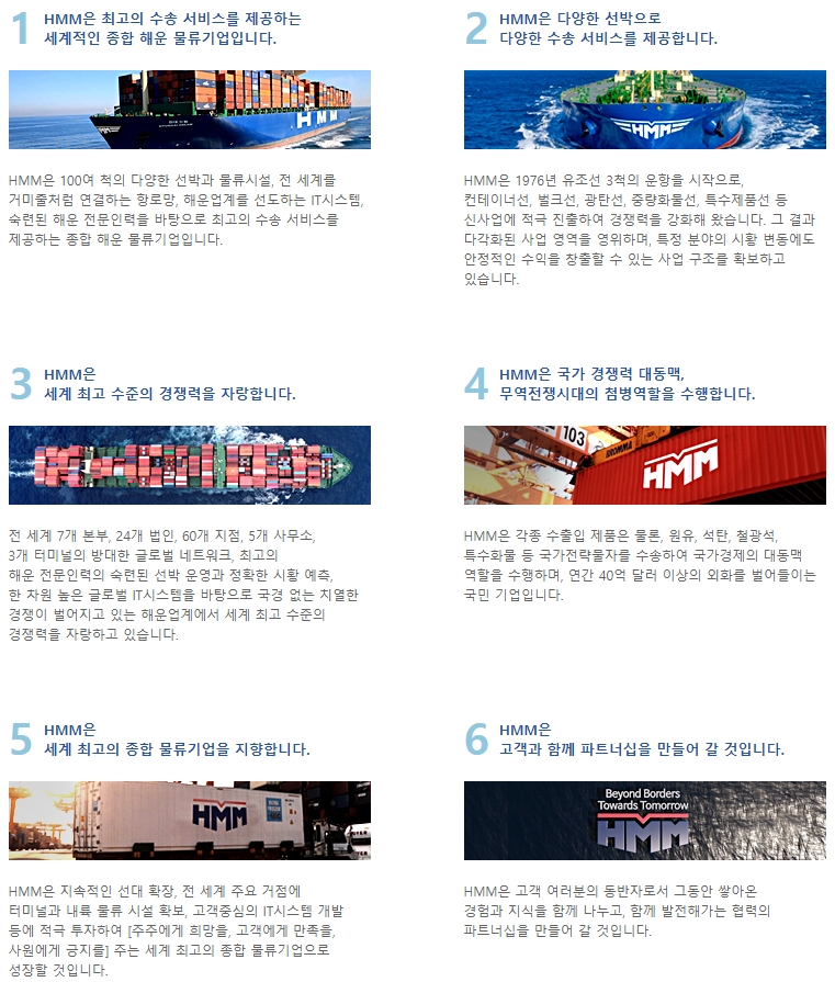 HMM은 현재 컨테이너 운송, 벌크화물 운송사업을 하고 있으며 세계적인 종합 해운 물류기업입니다.