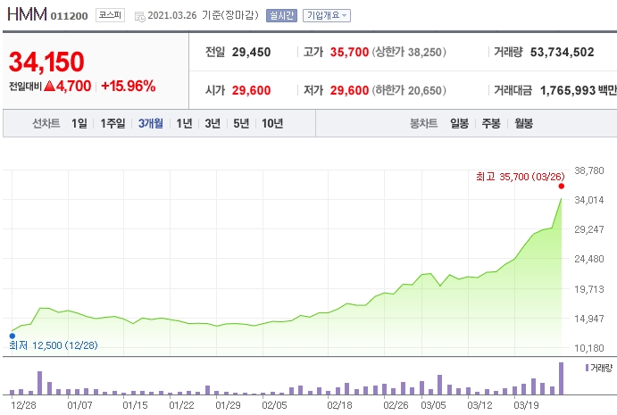 HMM의 주가를 살펴보면 작년 12월 말 12,500원대의 주가였지만 약 3개월만에 35,700원으로 치솟으며 단시간에 300% 넘게 주가가 오른 모습을 보여주고 있습니다.