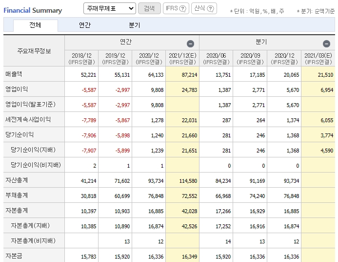 재무제표를 살펴보면 2019년까지 영업이익이 적자였지만 2020년 코로나로 인해 제품 수출로 장기 계약을 따내면서 영업이익이 크게 늘어나면서 주가도 함께 오르는 모습을 보이고 있습니다.