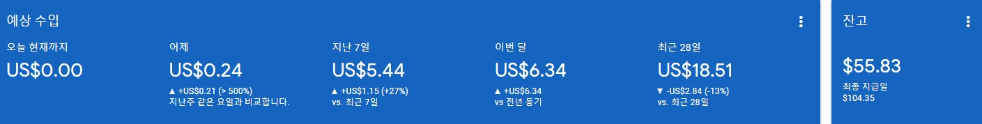 나는 네이버 블로그와 티스토리를 번갈아가면서 포스팅을 하고 있으며 사실 수익이 조금 더 잘 나오는 곳은 티스토리가 아닐까 싶다. 2개월 동안 열심히 포스팅을 하면서 약 $70달러를 벌었으며 앞전에 $116달러가 모여서 수익을 창출했던 적이 있다.