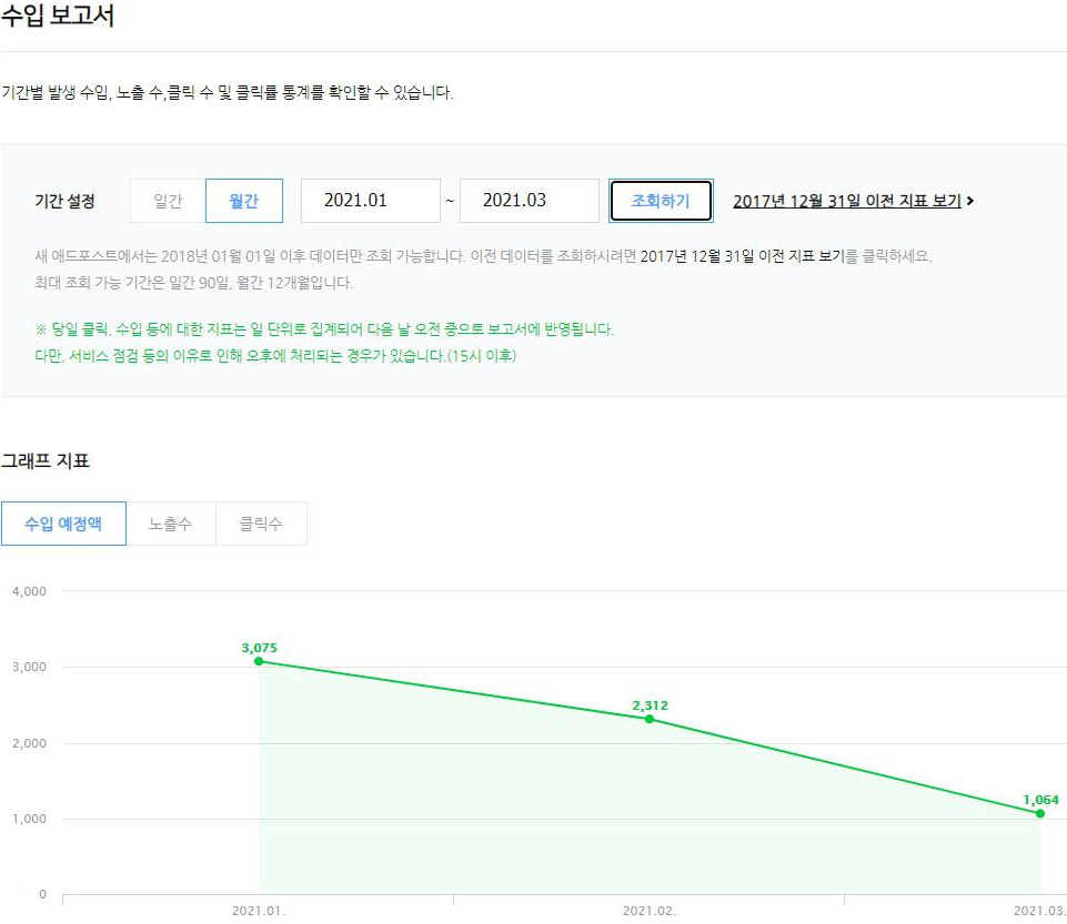 작년 12월부터 회사를 다니면서 네이버 블로그는 신경을 못쓰다 보니 수익이 많이 줄어들었어요. 한 달에 1-2만 원씩 꾸준하게 수익이 났었지만 포스팅을 안 하면서 자연스럽게 수익이 감소하는 모습을 보였는데 다시 포스팅을 하면 수익이 늘어난답니다.