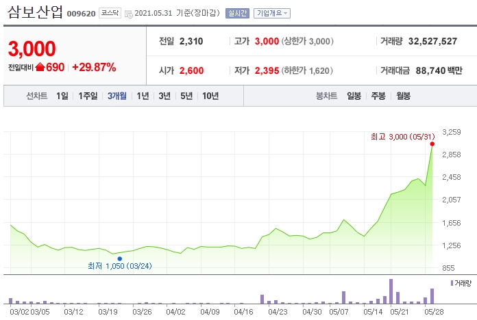 3월달에 1,000원이었던 주가는 3개월만에 3,000까지 올라가서 300%나 상승한 모습을 보여줬습니다.