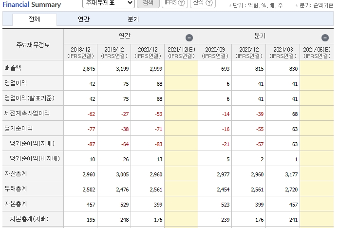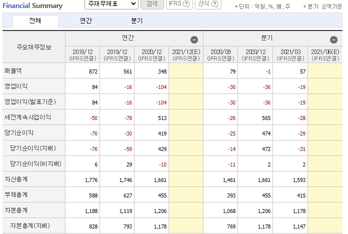 재무제표를 살펴보면 2020년부터 약 100억원대의 큰 폭의 적자를 기록했고, 올해에도 적자를 기록하며 불안한 기업의 가치를 보여주고 있습니다.