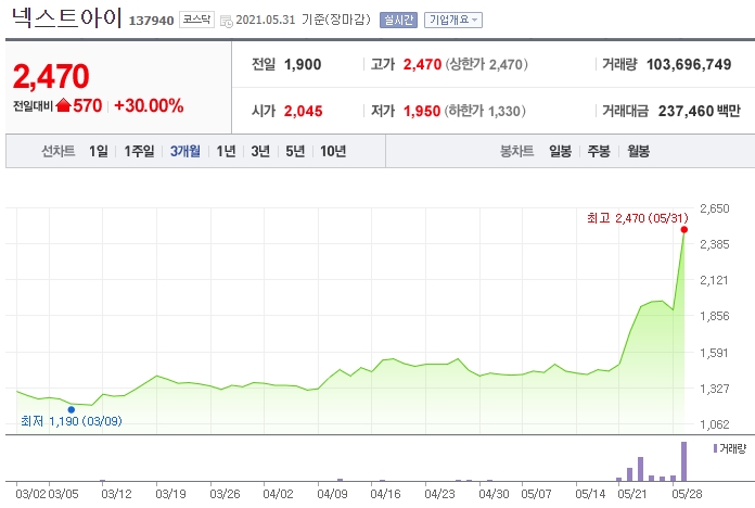넥스트아이 또한 3월달에 1,190원이었던 주가는 3개월이 지나 약 2,470원으로 2배나 상승했습니다.