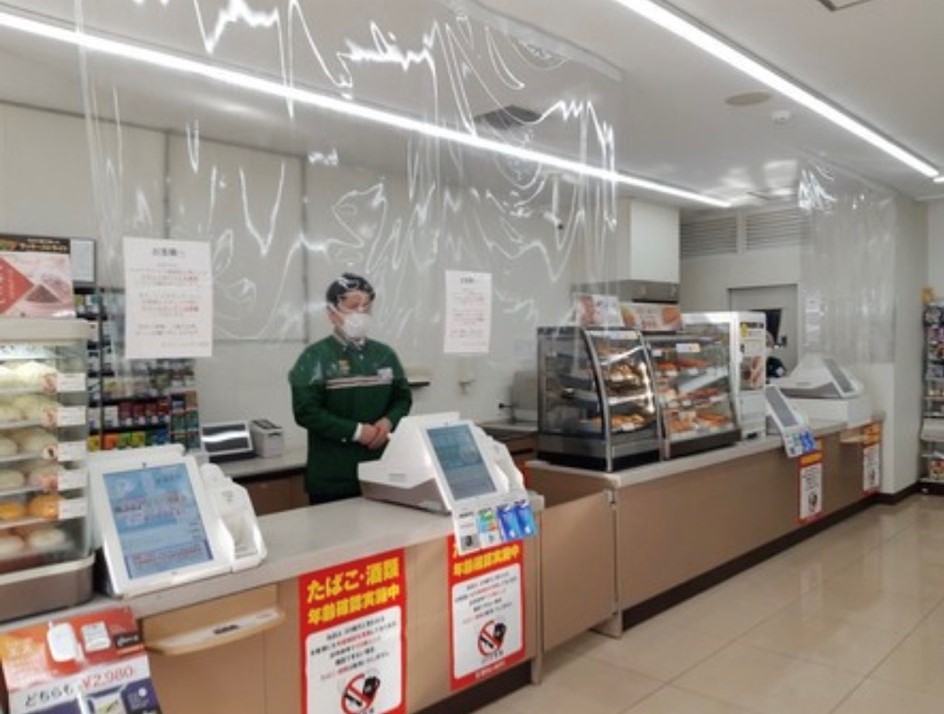 대부분의 점포들은 비상사태 선언 종료기간인 5월 6일까지 휴업을 하고 있으며 편의점에서는 대부분 비닐천막을 치고 최대한 접촉을 피하려고 노력을 하고있다.